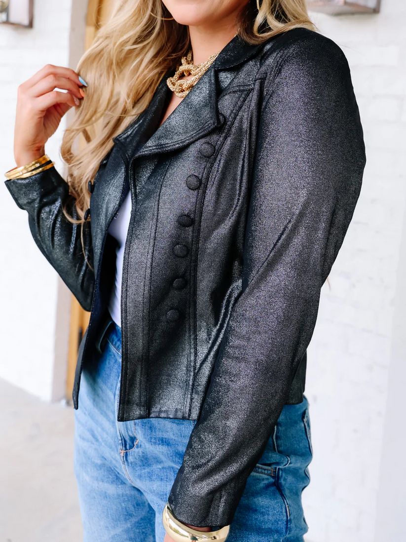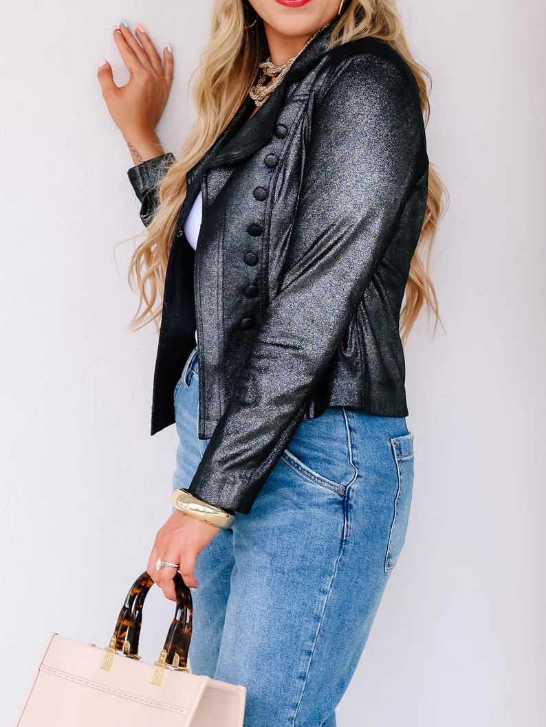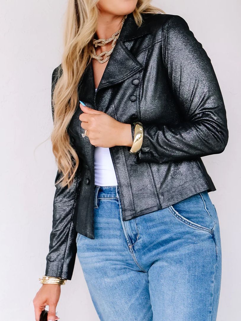 This waist-length jacket features a top collar and long sleeves for a polished look. The hook closure in the front and faux leather and zipper details add a refined touch, making it a stylish and versatile addition to your wardrobe.