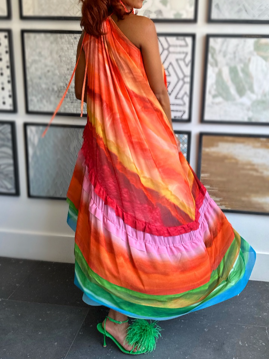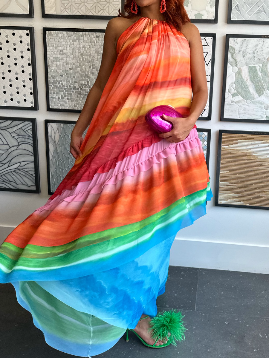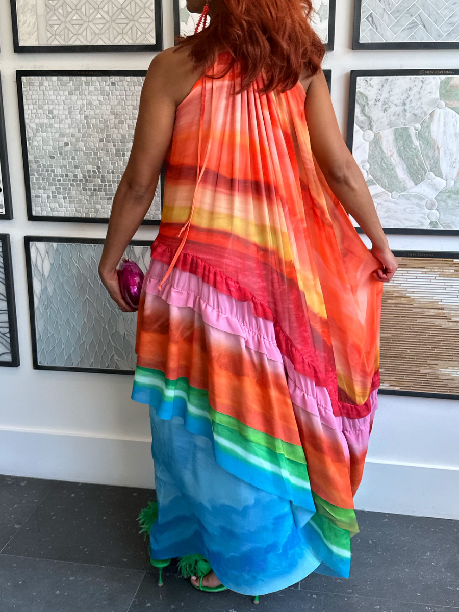 The Ruffle Dress isn’t just a dress – it’s a celebration of bold femininity. With its rainbow-hued layers and soft flowing pleats, this statement piece was made for women who want to stand out without saying a word. Whether you’re dancing at a garden party or making an entrance on holiday, this dress moves like water and shines like sunlight.
