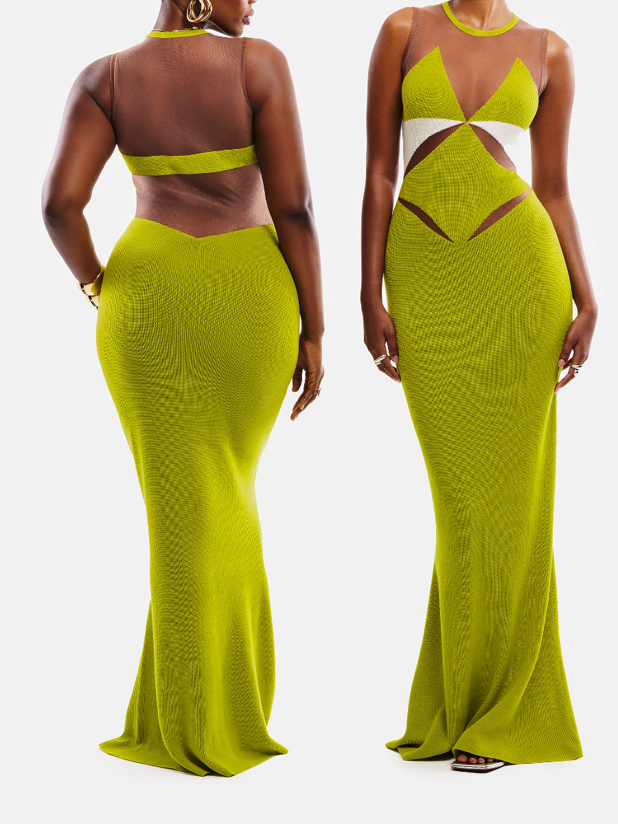 The dress is a light weight maxi knit dress with cut-out sheer mesh detailing, designed to enhance your confidence.