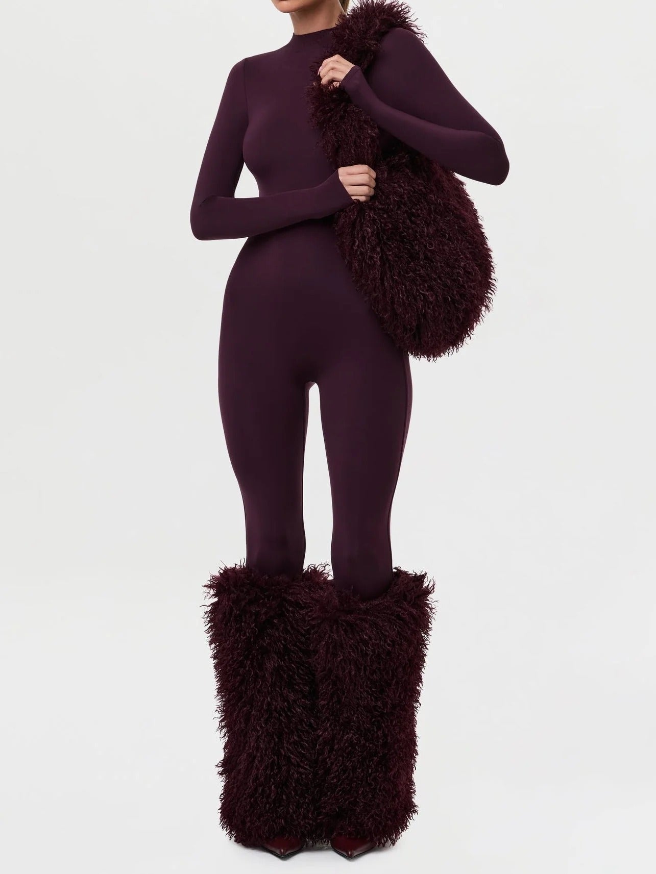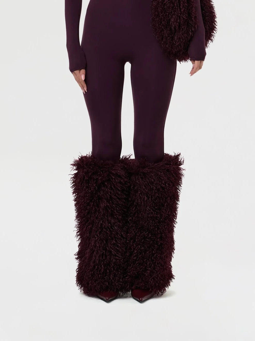 Our runway inspired and fashion-forward plush leg warmers are constructed with an opulent Mongolian faux fur to elevate your aesthetic, and designed with built-in socks to keep you warm and cozy through cold temperatures. Style with our matching handbag to complete the look.