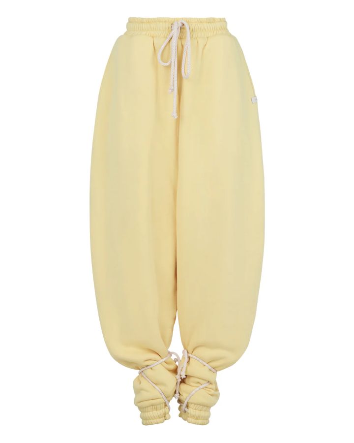 Very oversized, very cozy, cotton/modal fleece *super* joggers. Designed to fit very oversized with a reversible option - meaning you can wear them like regular terry sweatpants or reversed for a cozy, fuzzy, fleece-y textured "teddy bear" vibe. Side pockets on both sides. Fabric is doubled for an extra thick and squishy feel. Elasticized, drawstring waistband and ankle cuffs. Cotton drawstrings at ankles and waist. 50% Cotton, 50% Modal. Made in LA. 31 inch inseam on size Small with a 20 inch drop crotch. 51 inches from waist to ankle. Add one inch per size up. Item fits very oversized. Order your normal size in sweatpants for the baggy fit shown in look book photos. Both models (heights 5'2 - 5'6) wear size Small