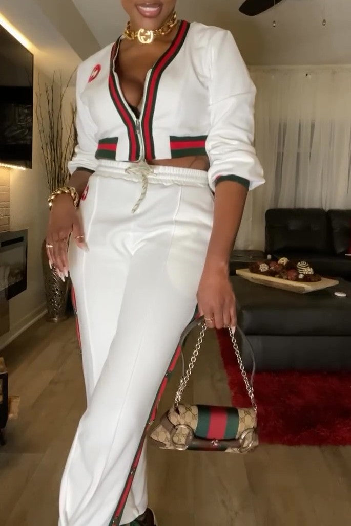 Web-stripe press-stud track pants set from Our featuring white, jersey texture, signature Web-stripe trim, logo patch to the side, side press-stud fastening, elasticated drawstring waistband, two side slash pockets and wide leg.