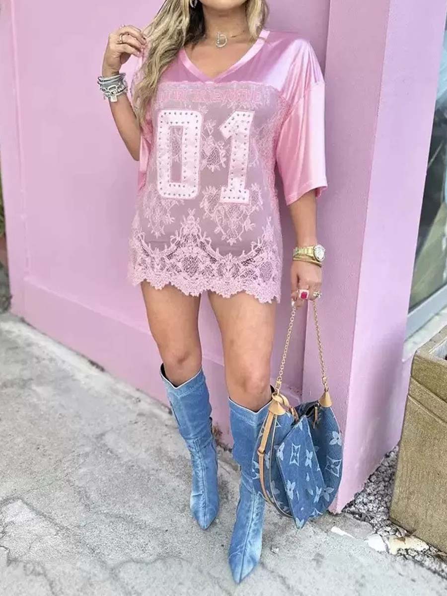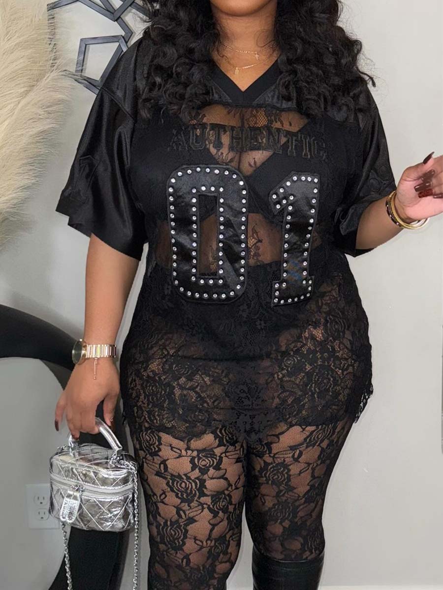 Printed Loose Casual Sexy Lace Patchwork T-shirt