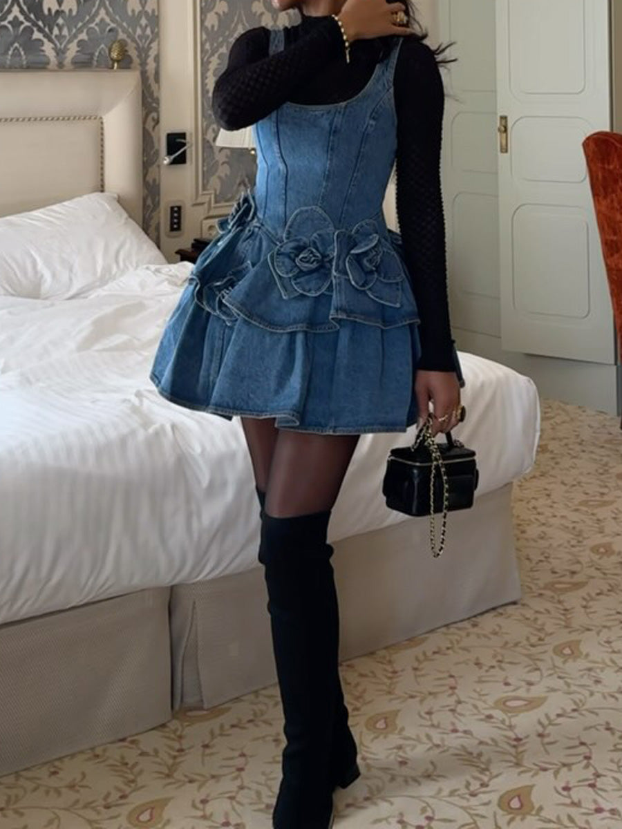 Scoop Neck Rose Appliqué Ruffle Hem Dress