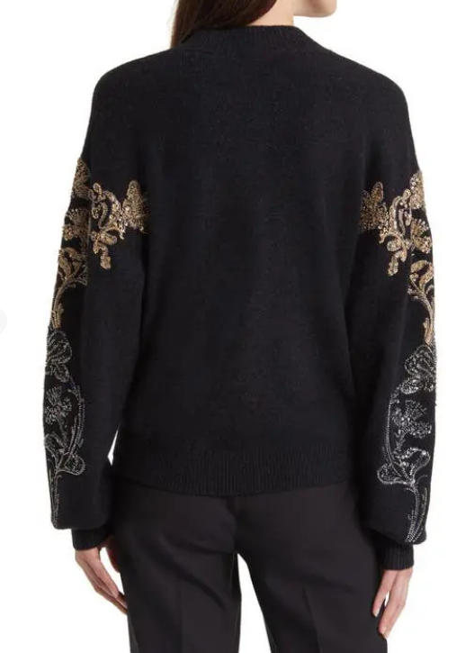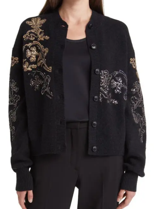 Florentine scrolls illuminated with shimmering sequins wend their way across this fuzzy wool-blend cardigan.